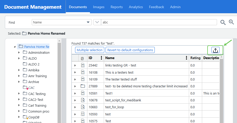 Managers can export document search results to CSV format for further analysis and record-keeping. The downloaded file will include Document ID A unique identifier assigned to each Panviva document for version tracking and linking., Document Name, and Folder information.