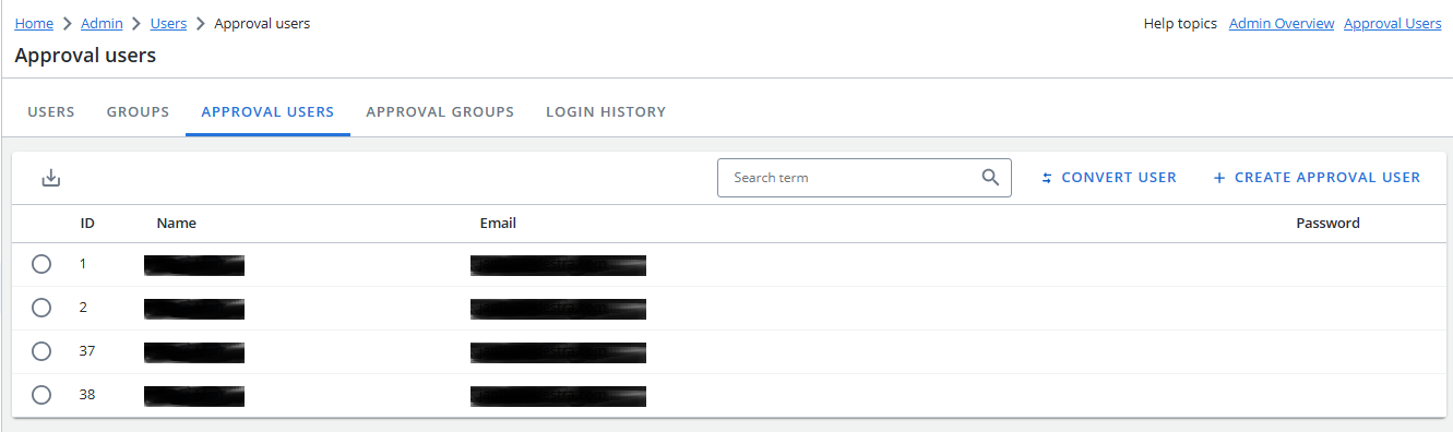 You can access the approval user pages via the 'Admin' tab in the header bar at the top of the screen, then the 'Approval Users' tab. The approval users list page displays any existing approval users.