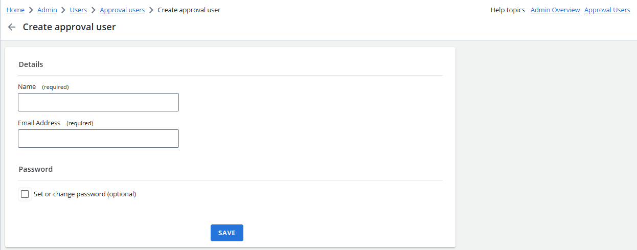 The form requires basic details for the user, including the user group and email address. You also have the option to add a password, which the approval user will be prompted to enter before they can provide their response to an approval request.