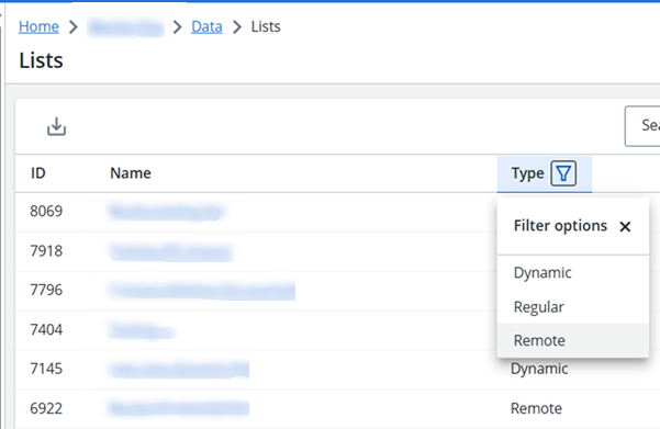 Tip: use the filter options in the Type column to filter for remote lists.