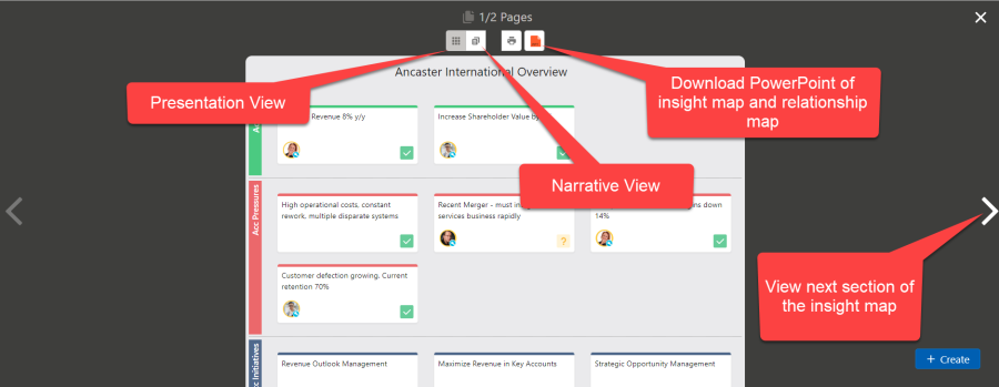 When you're presenting your insight map to the customer, it can be useful to switch to a slideshow view. This has options that help you to prepare for a presentation to the customer (including the generation of a PowerPoint file), and then present the insight map to them sequentially, section by section.