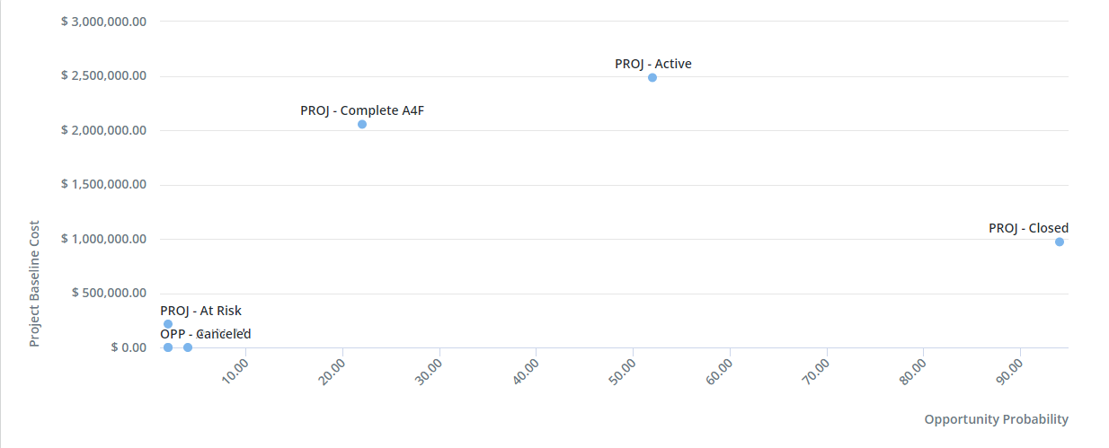 Bubble charts display the relationship between three data fields. Each dot corresponds with a single data point, and the variables’ values for each point are indicated by horizontal position, vertical position, and dot size.