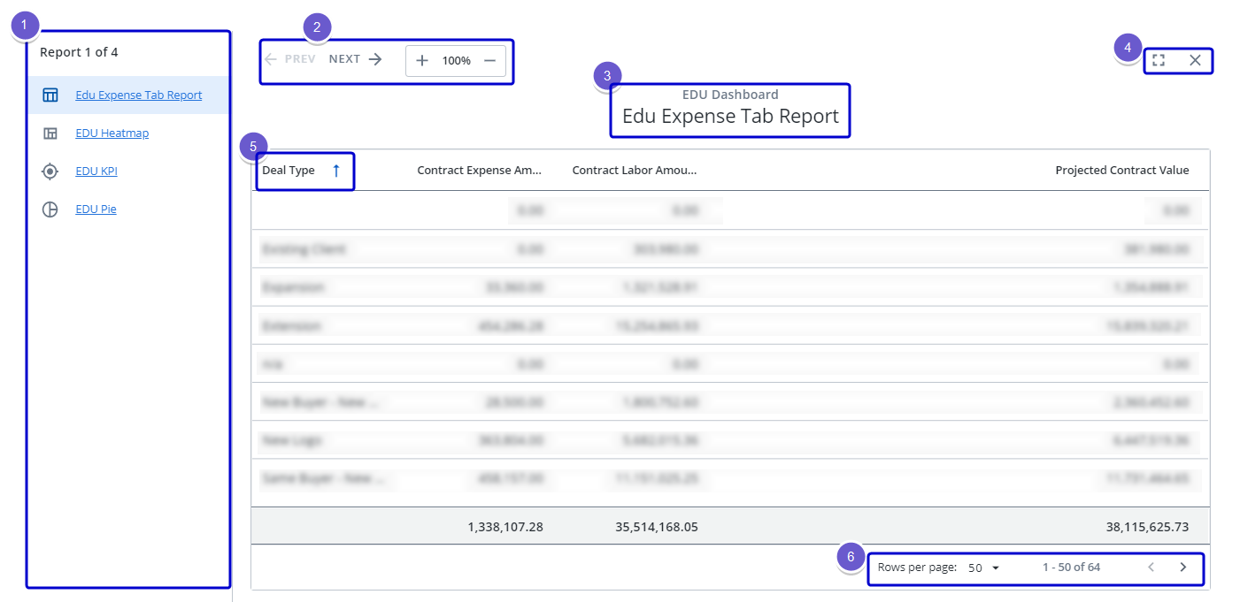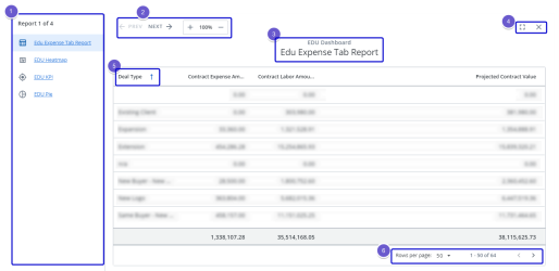descending order. - Available for reports only, when a report has a large number of records, you can choose how many rows of records to display per page and navigate pages.