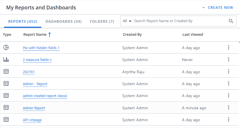 The My Reports and Dashboards area contains all of the reports, dashboards and folders that you have access to. Select the item to open it or open the See More menu