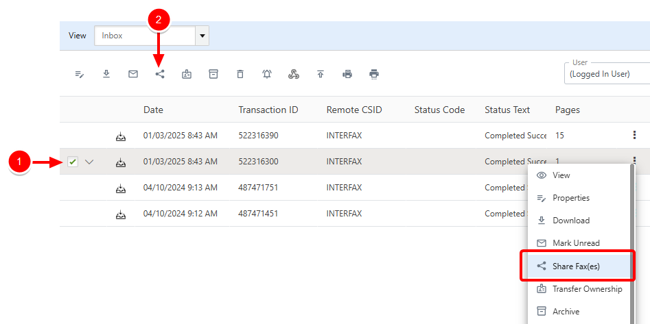 Right-click anywhere in the fax row or click the three dots next to the fax you want to share, then select Share Fax(es) from the drop-down menu.