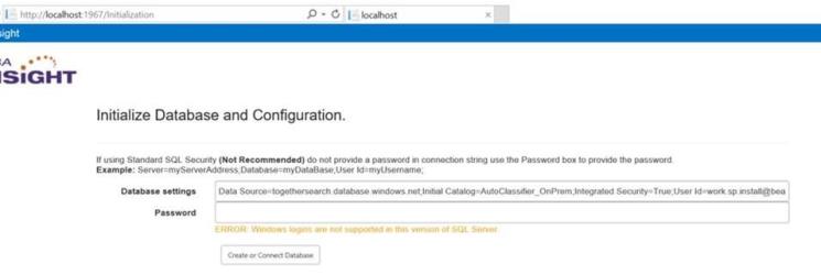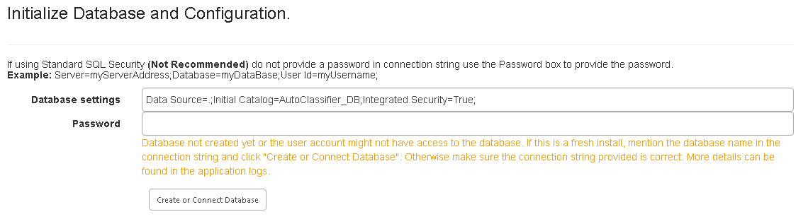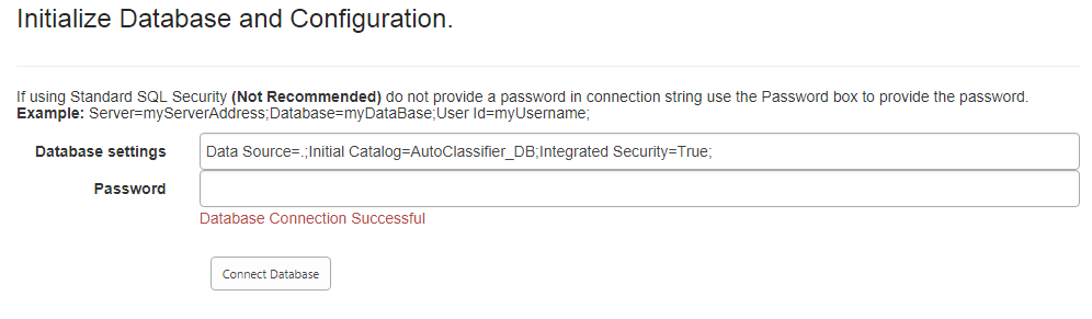 - Update this connection string with the settings of your existing AutoClassifier database and click Connect Database, if necessary.