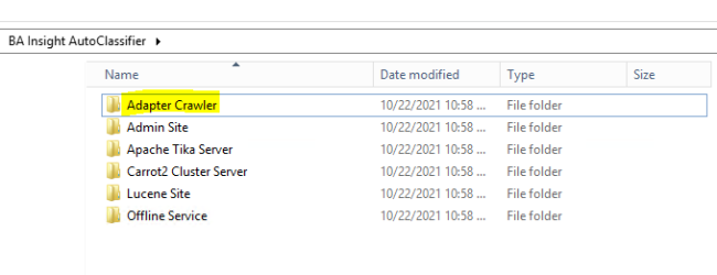 - The Adapter Crawler is installed as a Windows Service and is installed in the same base location as the AutoClassifier Engine Site
