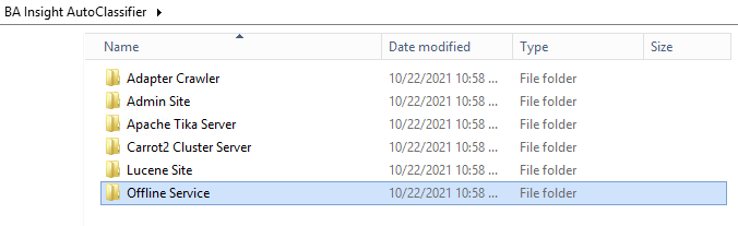 The Offline Processing service is installed as a Windows service and is installed in the same location as the AutoClassifier Engine Site.