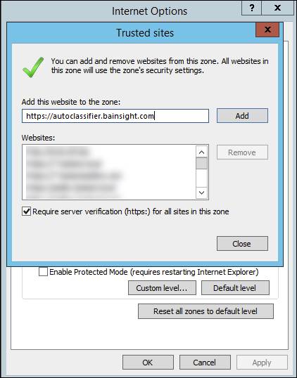 - Open Internet Explorer → Internet Options → Security → Trusted Sites.