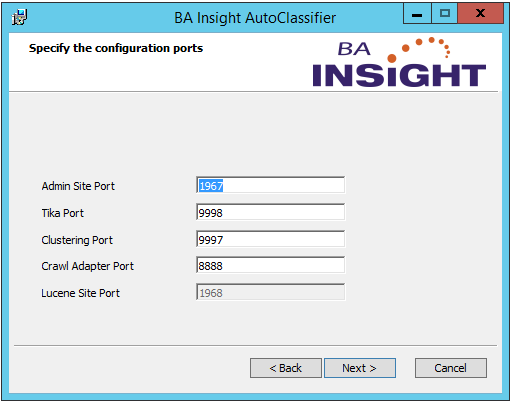 - Accept the default configuration ports or enter your own values. Note these values in the Installation Prerequisite checklist.
