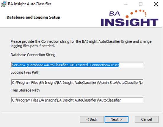 - Configure the AutoClassifier database connection string, including:
