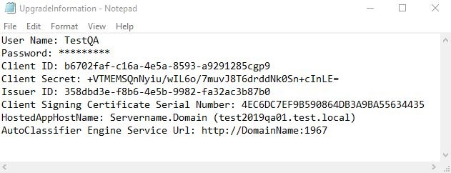 - Create a text file (see the graphic below) to store the information required to install the AutoClassifier Engine and Add-in: