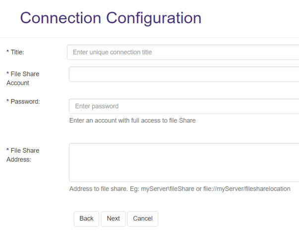 Note that the steps below use the File Share connector as an example, but the configuration fields shown on you screen will be specific to the Connector you are setting up.