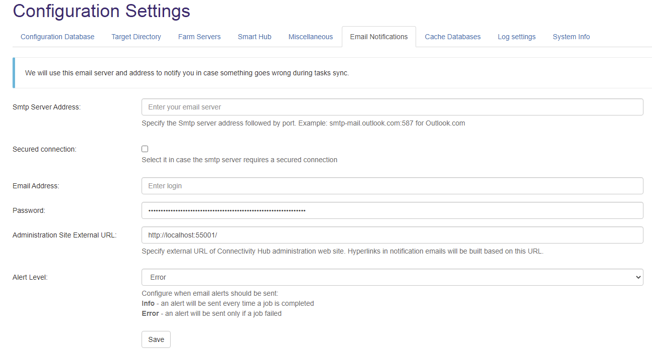 Connectivity Hub uses the information provided under the Email Notifications tab to send emails regarding crawls and job status.