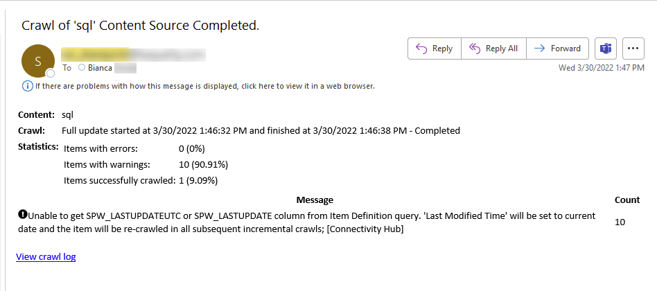 The email contains important details as well as a link to view the crawl log for an even more detailed look at the crawl log.