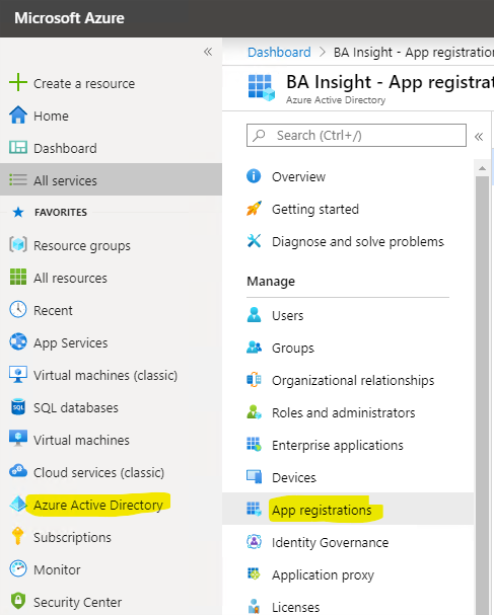 - Click Azure Active Directory and then App registrations. See the graphic below: