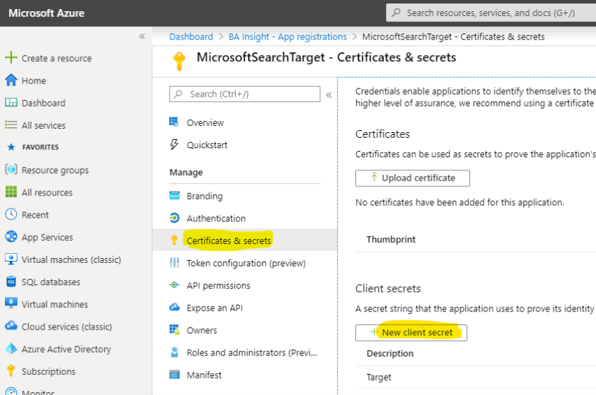 - Navigate to the Certificates & secrets page. See the graphic below.