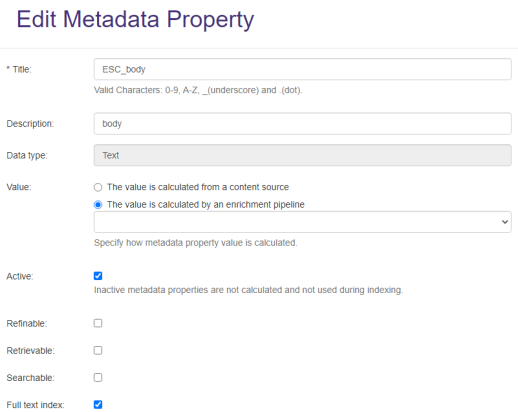- Make sure to mark the property returned by Tika Text Extractor service as Active and Full Text Index: