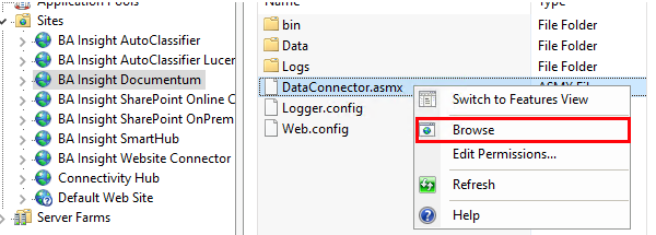 - "Browse" the file DataConnector.asmx, shown below to see your web service URL in a web browser: