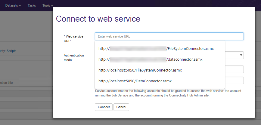 When you place your cursor in the Web service URL field, a list of previously-entered web service URLs may appear, if this information has been entered into this browser before (Chrome browser is shown in the graphic below).