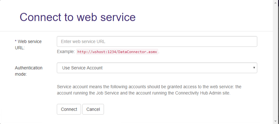 - "Specify User Account" requires a user name and password. See "Advanced Web Service Connection Options (Optional)" below for more information.