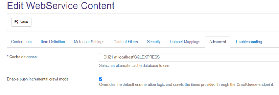 Push incremental crawl mode enables you to override the default enumeration process for incremental crawl and configure Connectivity Hub to crawl the items and folders feed via the CrawlQueue API.