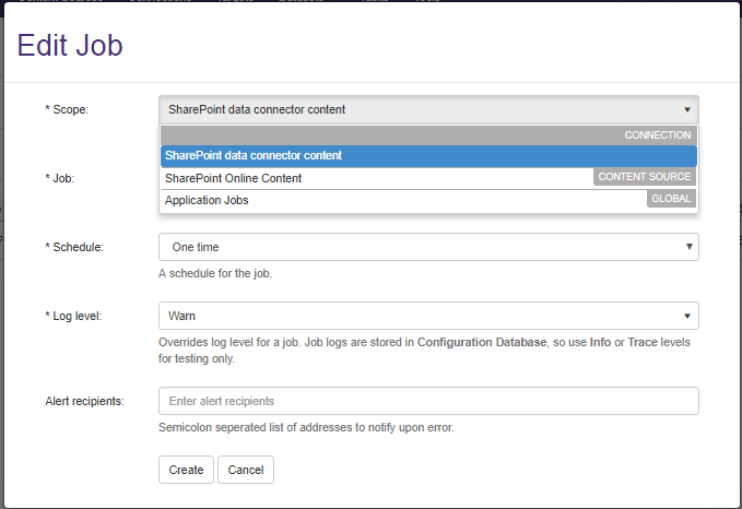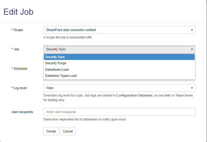 - Set the Schedule and Log level and click the Create button to run the job.