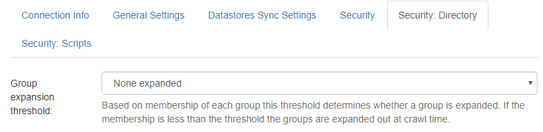 Group expansion threshold: By default, this setting is None expanded, which means at crawl time, you can see the list of users and groups that have access to an item, but you conserve system resources that would otherwise be used to expand a large groups of users.