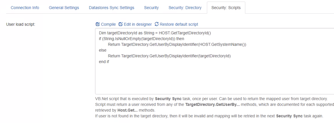 - User load script: Use the provided script or write a VB.Net script that is executed by the Security Sync task, once per user security mapping. This script can also be used to modify the AD identifiers of users' security mappings.