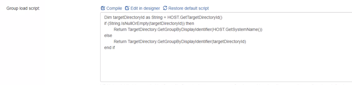 - Group load script: Use the provided script or write a VB.Net script that is executed by the Security Sync task, once per group security mapping. This script can also be used to modify the AD identifiers of groups' security mappings.