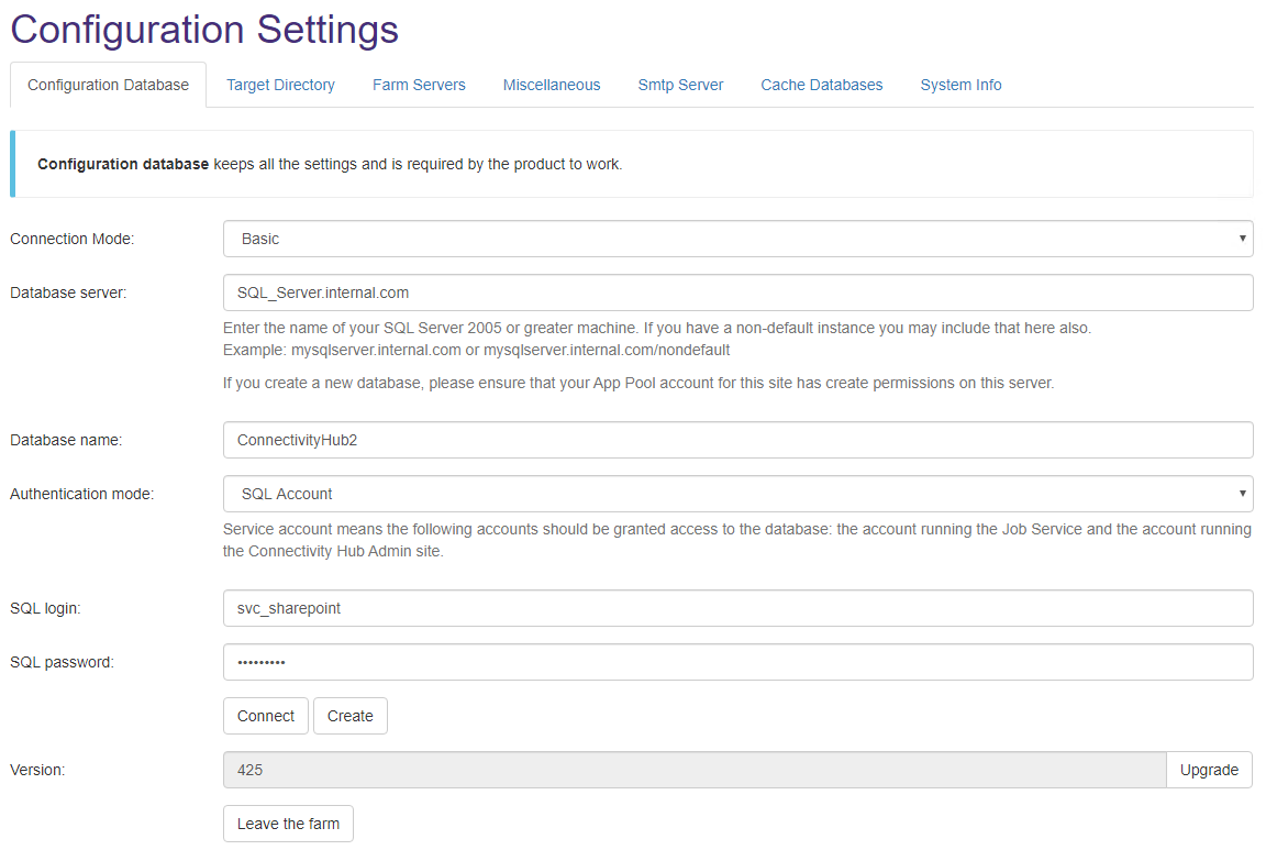 - The fields shown contain the settings that are required by the Connectivity Hub to function. Enter the appropriate values in the fields for your database.