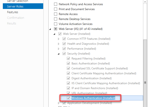 - Install the Windows Authentication role service (Web Server (IIS) > Security > Windows Authentication)