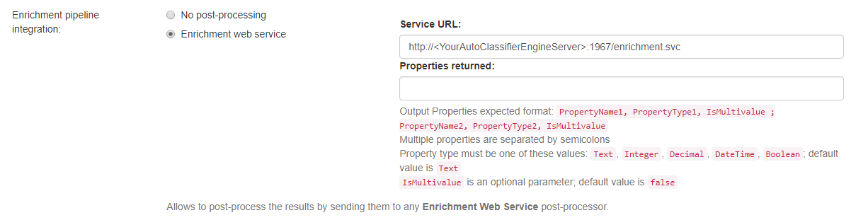- AutoClassifier Example: http://<YourAutoClassifierEngineServer>:<port>/enrichment.svc