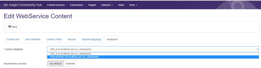 - Select Tools > Configuration from the BA Insight Connectivity Hub and select the Cache Databases tab.
