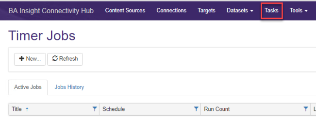 - To schedule a crawl against a defined Target, select Tasks from the links at the top of the Connectivity Hub page.