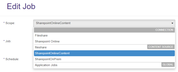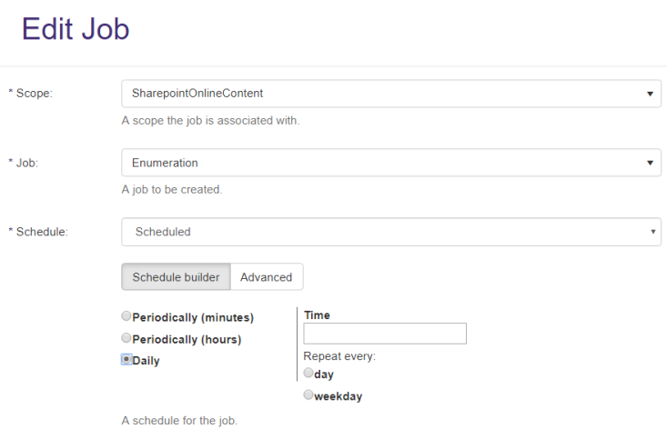 - Scheduled: Set the frequency of the crawl by clicking the Schedule builder button or click the Advanced button to schedule the job in cron format.