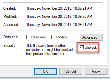 2. Right-click the ZIP file and select Properties from the menu that appears. Check the Unblock checkbox at the bottom of the dialogue and click OK.