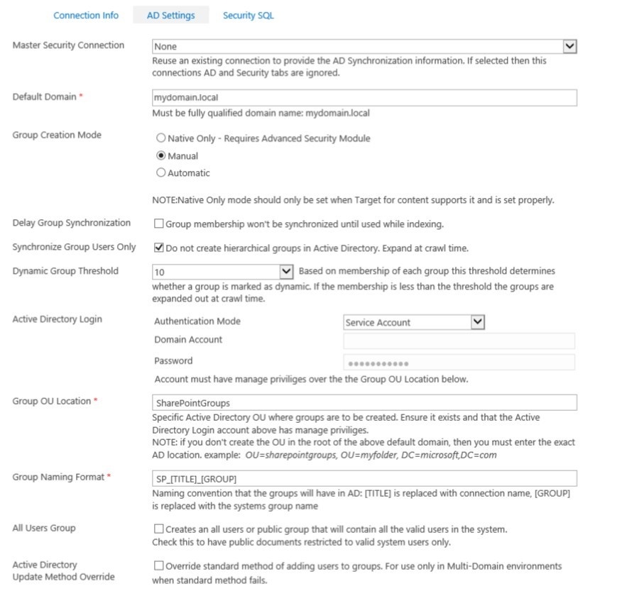 This is the domain where your AD user accounts exist. - The source system users are mapped to these domain accounts, and security groups are created or populated based on the settings below.