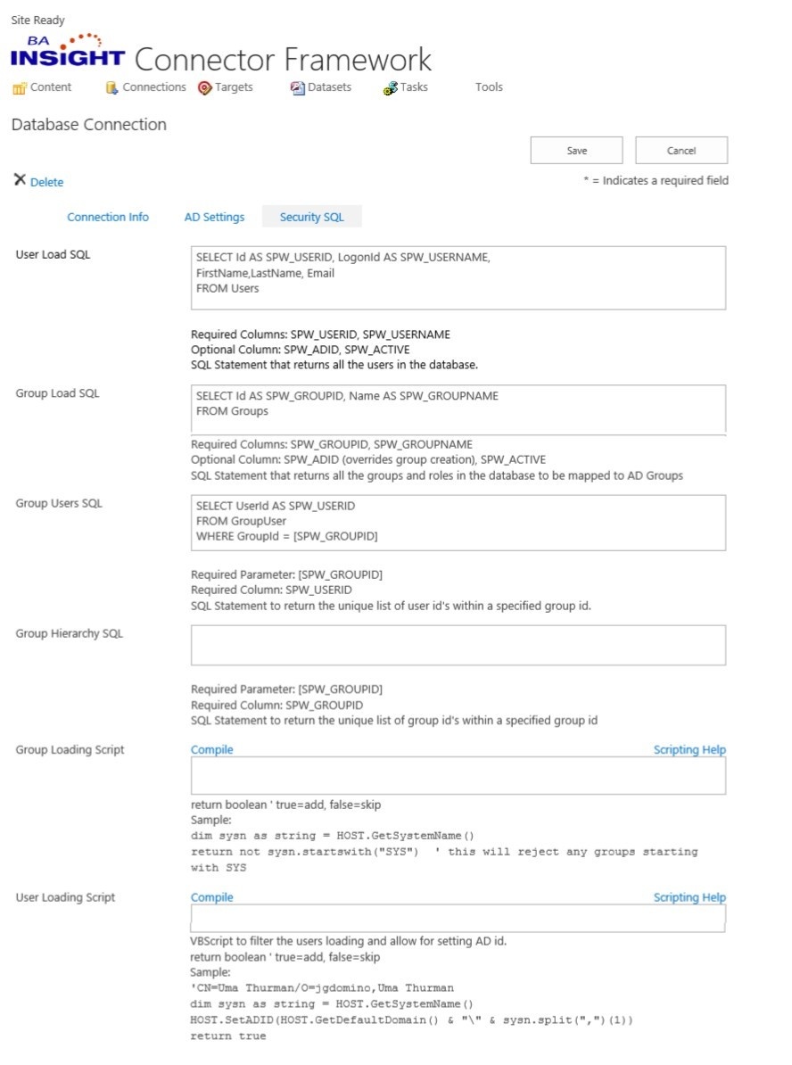 The information provided on the Security SQL tab determines how the SQL Connector identifies users, groups, and group members.