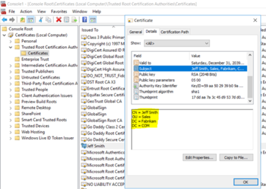For example: CN=Jeff Smith, OU=Sales, DC=Fabrikam, DC=COMIf you copy your certificate details, as shown below, you must ensure you use syntaxwithout a spaceor your certificate will not work.