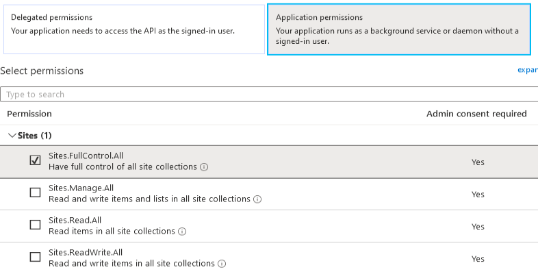 - Back in the "Configured permissions" menu, select the Sites.FullControlAll permission and click the Grant admin consent.. button to grant the selected permissions (requires admin rights).