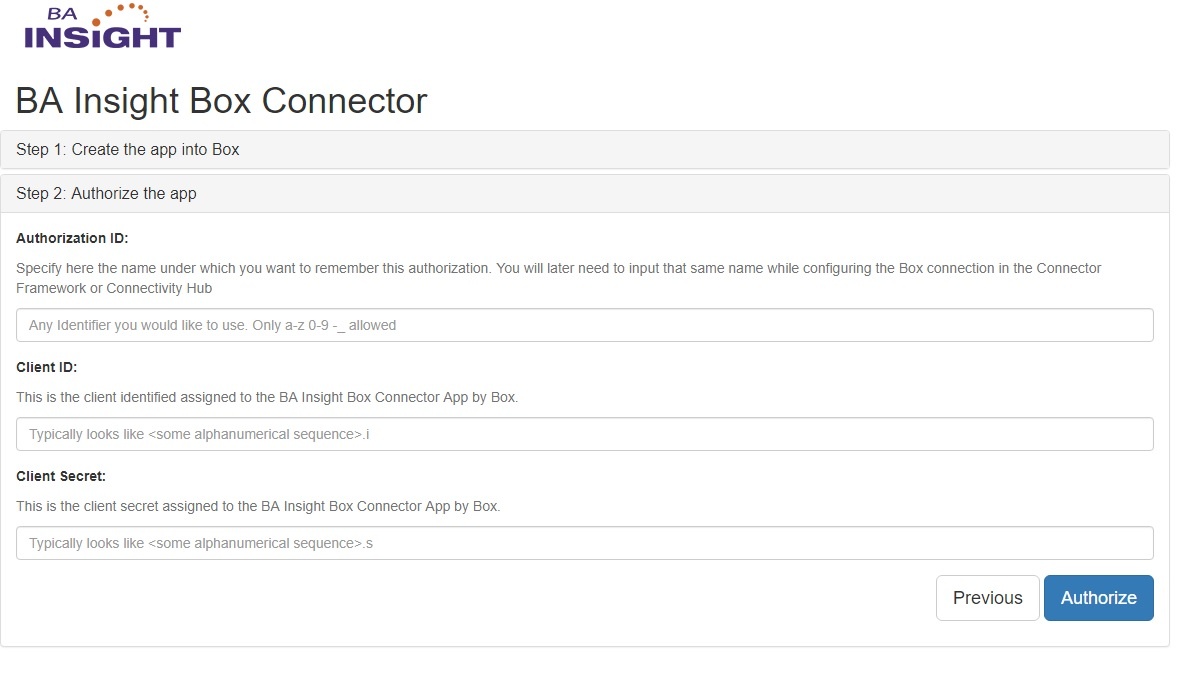 Note: Remember this name or save it in a text file because it is required when creating a Box Connection. - Insert the Client ID and Client Secret values that you saved from the Box Application in the previous steps.