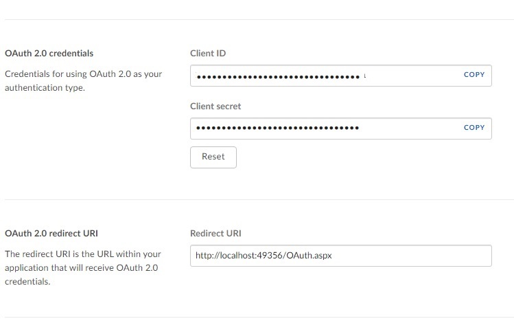 - Set the Redirect URI to the Authorization page as mentioned in the Authorization Page section of this documentation. e.g. http://localhost:<port number>/OAuth.aspx