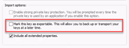 If you use another program, such as IIS, when you export the certificate, ensure you do not mark the key as exportable: