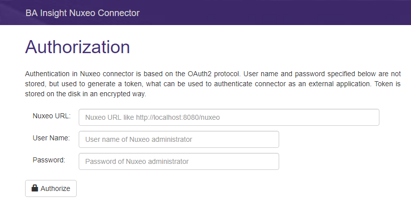 - In the appropriate fields, specify the Nuxeo URL and Nuxeo Administrator account, and then click the 'Authorize' button.