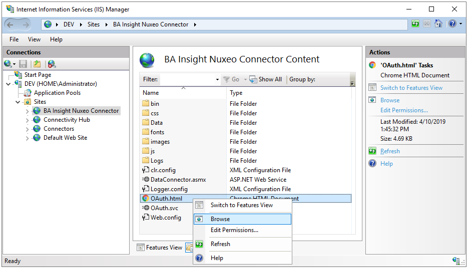- Start IIS Management Console. Select "BA Insight Nuxeo Connector" under "Sites" on the left-side Connections pane.