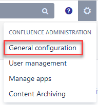 - From within Confluence, click the "sprocket" icon in the top left corner and select the General configuration page: