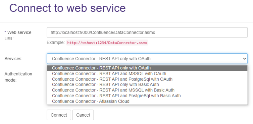 - If you do not have a Confluence connection, create a connection by a creating a new Web Service connection.