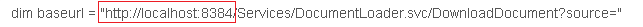 dim baseurl = "http://localhost:8384/Services/DocumentLoader.svc/DownloadDocument?source="dim crawlurl as string =  HOST.URLEncode( HOST.GetStringValue("SPW_CRAWLURL"))