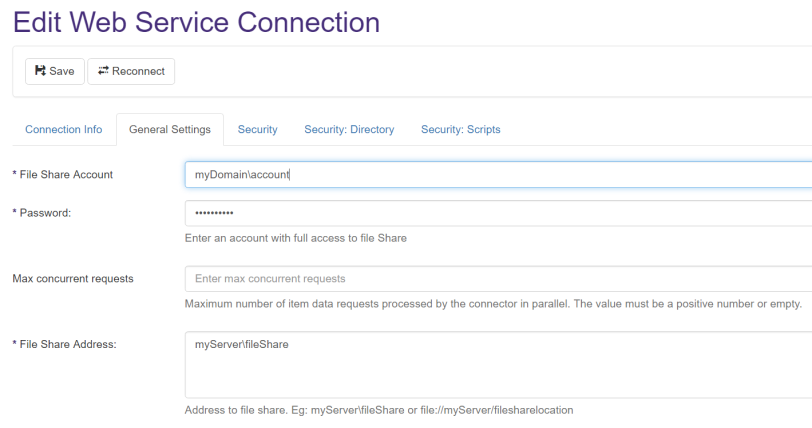 Follow the procedure set for your connector framework application and use the File Share-specific connection settings below to complete your setup.